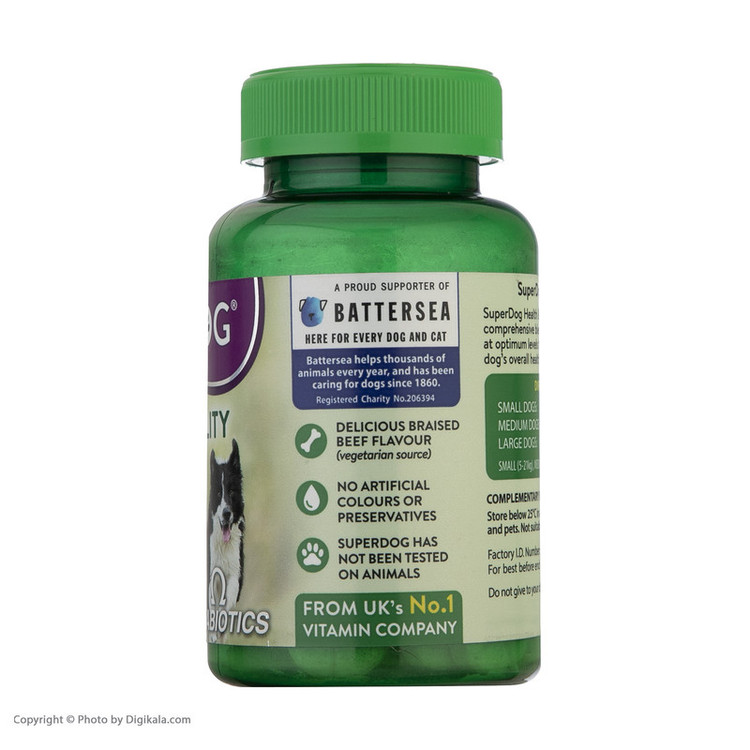 مکمل های حیوان خانگی SuperDog Health & Vitality حاوی ترکیبی پیچیده از مواد مغذی ضروری برای ارتقاء سلامت و تندرستی کلی سگ شما، صرف نظر از اندازه و نژادشان است. سلامتی یک سگ تقریبا شبیه به انسان است. سگ به عشق، مراقبت و توجه کافی، ورزش فراوان، رژیم غذایی متنوع و متعادل و دریافت کافی ویتامینها و مواد معدنی ضروری نیاز دارد. مکملهای SuperDog Health & Vitality توسط متخصصان Vitabiotics فرموله شدهاند تا برای سگ شما از حمایت تغذیهای پیشرفته برای محافظت از رژیم غذایی خود استفاده کنند و به شما آرامش دهند که نیازهای تغذیهای آنها به طور ایدهآل پشتیبانی میشود. با 50 سال تجربه در تحقیقات ویتامین و تغذیه، به عنوان اولین شرکت ویتامین بریتانیا، مفتخریم که از این تخصص منحصر به فرد برای توسعه محصولات مدل SuperDog استفاده کرده ایم. ارائه مراقبت در سطح متخصص برای همراه خاص خود، با فرمولهای واقعا جامع و با دقت توسعه یافته و کار در کنار متخصصان سلامت سگ، باعث شده تا محوصلاتی تخصصی و جامع به شما ارائه شود.