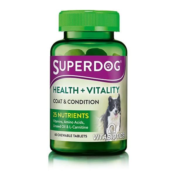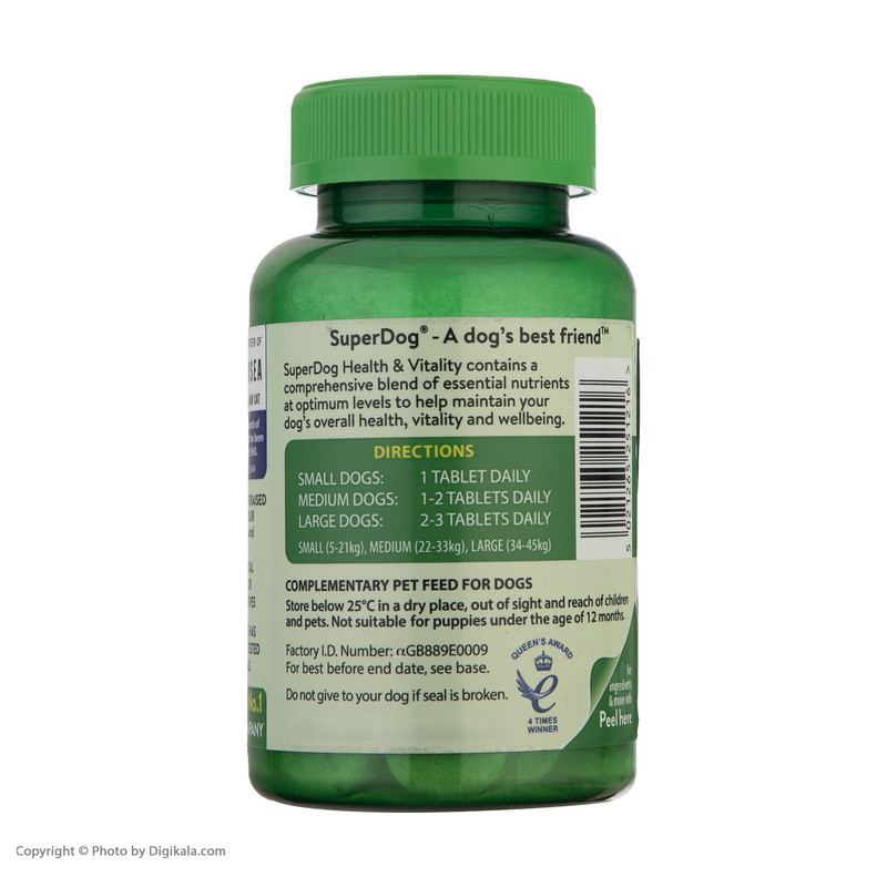 مکمل های حیوان خانگی SuperDog Health & Vitality حاوی ترکیبی پیچیده از مواد مغذی ضروری برای ارتقاء سلامت و تندرستی کلی سگ شما، صرف نظر از اندازه و نژادشان است. سلامتی یک سگ تقریبا شبیه به انسان است. سگ به عشق، مراقبت و توجه کافی، ورزش فراوان، رژیم غذایی متنوع و متعادل و دریافت کافی ویتامینها و مواد معدنی ضروری نیاز دارد. مکملهای SuperDog Health & Vitality توسط متخصصان Vitabiotics فرموله شدهاند تا برای سگ شما از حمایت تغذیهای پیشرفته برای محافظت از رژیم غذایی خود استفاده کنند و به شما آرامش دهند که نیازهای تغذیهای آنها به طور ایدهآل پشتیبانی میشود. با 50 سال تجربه در تحقیقات ویتامین و تغذیه، به عنوان اولین شرکت ویتامین بریتانیا، مفتخریم که از این تخصص منحصر به فرد برای توسعه محصولات مدل SuperDog استفاده کرده ایم. ارائه مراقبت در سطح متخصص برای همراه خاص خود، با فرمولهای واقعا جامع و با دقت توسعه یافته و کار در کنار متخصصان سلامت سگ، باعث شده تا محوصلاتی تخصصی و جامع به شما ارائه شود.
