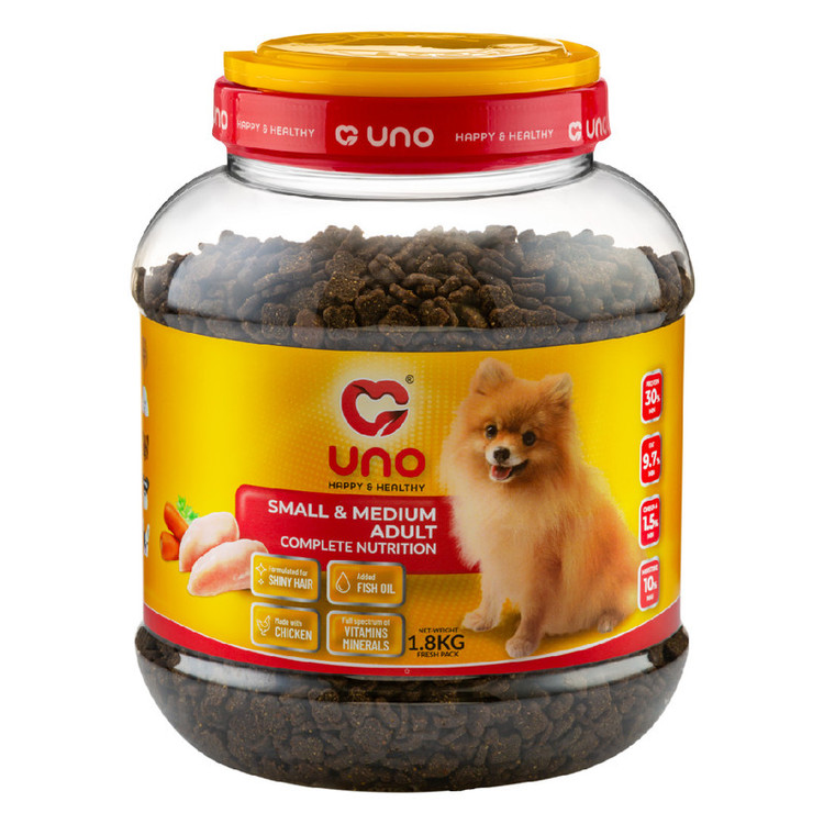 غذای سوپر پریمیوم سگ بالغ نژاد کوچک و متوسط اونو UNO یک غذای بسیار خوش خوراک با 30% پروتئین خالص آزمایش شده است. کلیه محصولات اونو حاوی سری کامل ویتامین ها و مواد معدنی تامین شده از BASF آلمان، DSM هلند و Adisseo فرانسه میباشند. این غذا کلیه ویتامین ها و مواد معدنی مورد نیاز سگ شما را تامین میکند و نیازی به مکمل اضافی ندارید.