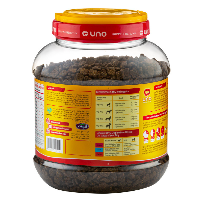 غذای سوپر پریمیوم سگ بالغ نژاد کوچک و متوسط اونو UNO یک غذای بسیار خوش خوراک با 30% پروتئین خالص آزمایش شده است. کلیه محصولات اونو حاوی سری کامل ویتامین ها و مواد معدنی تامین شده از BASF آلمان، DSM هلند و Adisseo فرانسه میباشند. این غذا کلیه ویتامین ها و مواد معدنی مورد نیاز سگ شما را تامین میکند و نیازی به مکمل اضافی ندارید.