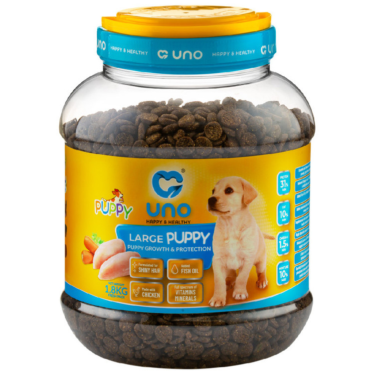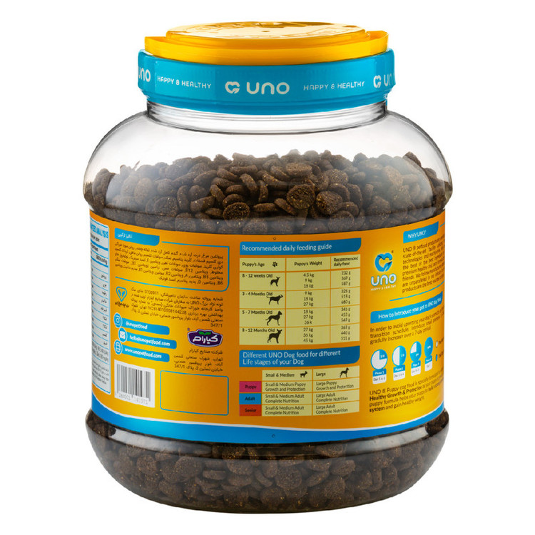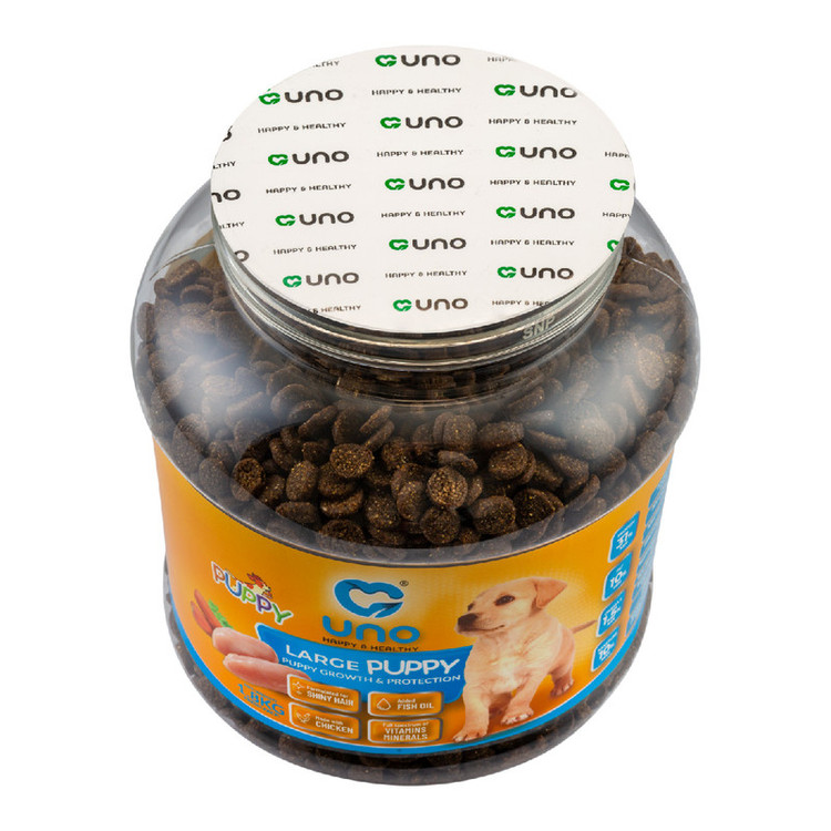 غذای سوپر پریمیوم سگ توله نژاد بزرگ اونو UNO یک غذای بسیار خوش خوراک با 31% پروتئین خالص آزمایش شده است. کلیه محصولات اونو حاوی سری کامل ویتامین ها و مواد معدنی تامین شده از BASF آلمان، DSM هلند و Adisseo فرانسه میباشند. این غذا کلیه ویتامین ها و مواد معدنی مورد نیاز سگ شما را تامین میکند و نیازی به مکمل اضافی ندار