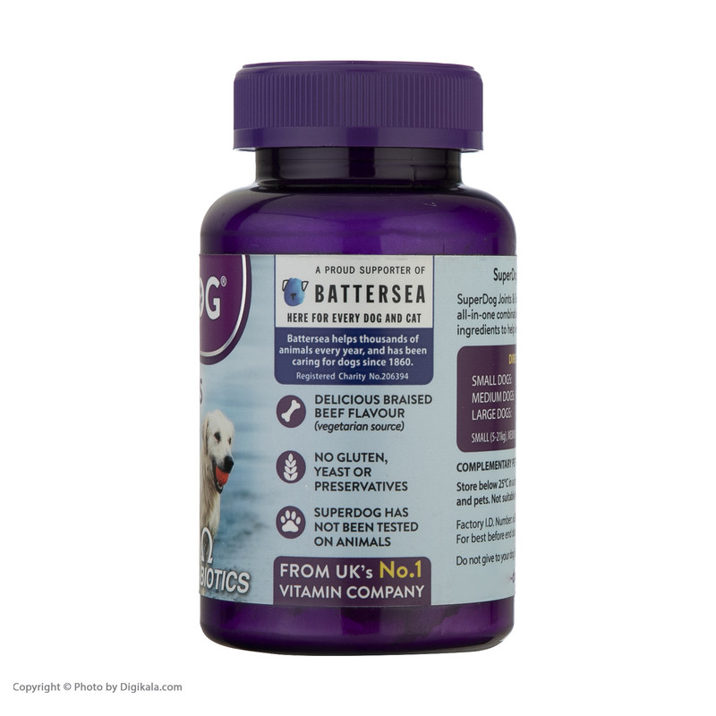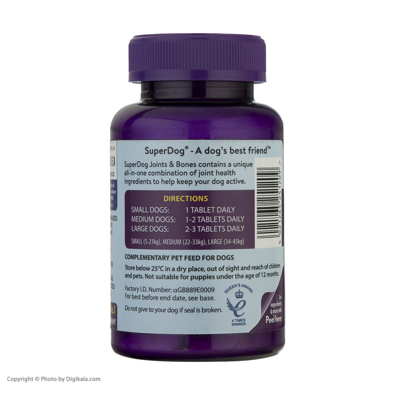 مکمل هدفمند بسته بندی شده با 22 ویتامین و مواد معدنی ضروری برای کمک به حمایت از مفاصل و استخوان ها، سگ شما را انعطاف پذیر و فعال نگه می دارد. قرص های جویدنی با طعم لذیذ گوشت گاو سرخ شده هستند که برای سگ بسیار جذاب خواهند بود. SuperDog یک مکمل غذایی مکمل حیوانات خانگی و به خصوص برای سگ است. این یک درمان یا دارو نیست. اگر سگ شما علائمی دارد یا حالش خوب نیست، فوراً به دامپزشک مراجعه کنید. صاحبان سگهای دیابتی باید قبل از استفاده از این محصول با دامپزشک خود مشورت کنند. آب آشامیدنی تازه باید همیشه تامین شود. دقت کنید که برای توله سگهای زیر 12 ماه مناسب نیست. SuperDog بر اساس 50 سال تحقیق تغذیه ای از Vitabiotics، شرکت شماره 1 ویتامین بریتانیا، و برنده 4 بار جایزه Queen شده است. به دلیل اینکه سلامتی و بهبود بدن سگ از بسیاری جهات شبیه به بدن انسان است؛ پس به عشق، مراقبت و توجه کافی، ورزش فراوان، رژیم غذایی متنوع و متعادل و دریافت کافی ویتامین ها و مواد معدنی ضروری نیاز خواهد داشت. مفاصل و استخوان های SuperDog حاوی ترکیبی منحصر به فرد از مواد تشکیل دهنده سلامت مفاصل و همچنین ویتامین های ضروری برای ارتقاء سلامت کلی، کمک به حفظ انعطاف پذیری و فعال نگه داشتن سگ شما است. 22 ویتامین و مواد معدنی ضروری در این قرصها وجود دارد که عبارتند از صدف لب سبز و MSM برای کمک به حفظ سلامت مفاصل سگ ها، گلوکزامین و کندرویتین برای حمایت از تولید کلاژن و محافظت از مفاصل با هم کار می کنند، اسیدهای چرب امگا 3 برای کمک به انعطاف پذیری و فعال نگه داشتن مفاصل، کلسیم با عوامل کمکی برای کمک به حفظ سلامت دندان و استخوان سگ.
